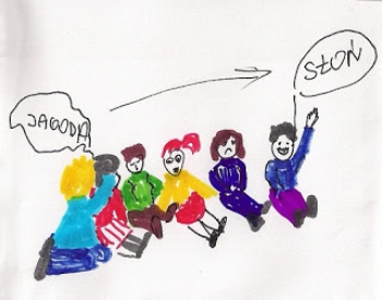 Wszyscy siedzą na podłodze jeden za drugim plecami do siebie ( patrzą na wprost). Ostatnia osoba na kartce zapisuje jakiś rzeczownik, następnie rysuje go palcem na plecach osoby przed nim. Przedostatnia osoba rysuje na plecach osoby przed nią, to co narysowała osoba za nią itd, aż do pierwszej osoby, która musi zgadnąć co ostatnia osoba zapisała na kartce.