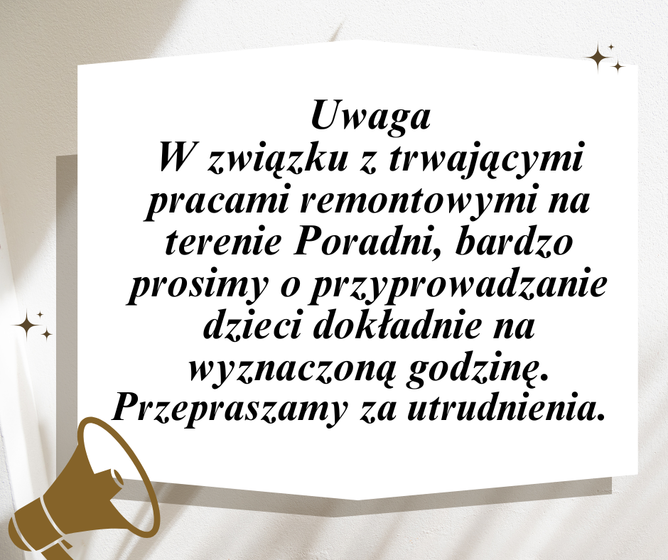 W związku z trwającymi pracami remontowymi na terenie Poradni, bardzo prosimy o przyprowadzanie dzieci dokładnie na wyznaczoną godzinę.